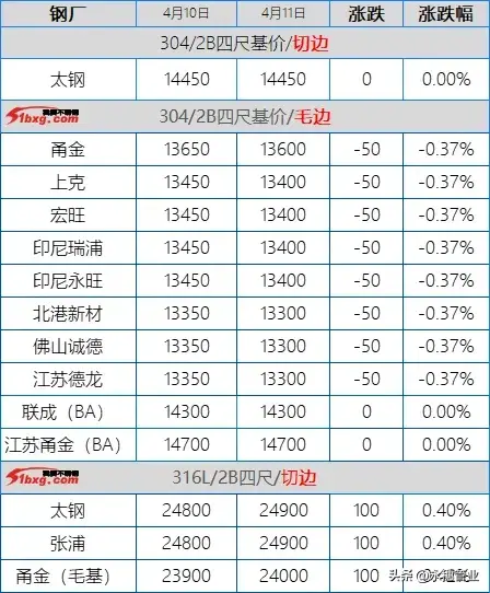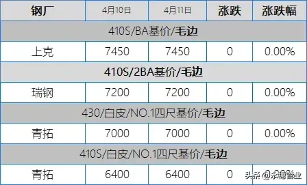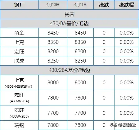 目前市場主流報價:410S熱軋黑皮在6100-6150元/噸,個別在6200元/噸左右;430熱軋黑皮在6700-6800元/噸;太鋼/酒鋼430/2B(毛)在8000-8100元/噸;聯(lián)眾430/2BA(毛)在7800-7900元/噸;宏旺430/2BA(毛)在7800-7850元/噸;甬金430/BA(毛)在8450元/噸左右;上克430/BA(毛)在8350元/噸左右;宏旺430/BA(毛)在8200-8250元/噸;瑞鋼430/2BA(毛)在7800元/噸左右;聯(lián)成430/BA(毛)在8250元/噸左右。