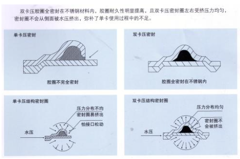 雙卡壓式膠圈密封在不銹鋼材料內(nèi),膠圈耐久性明顯提高,且雙卡壓密封圈左右受擠壓均勻,密封圈不會從側(cè)面倍水壓擠出,彌補(bǔ)了單卡壓適用過程中的不足。