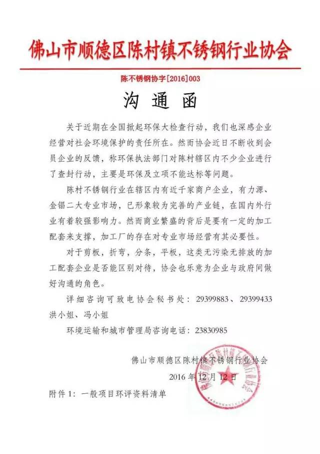 而就在本周初(12月12日),陳村鎮(zhèn)不銹鋼行業(yè)協(xié)會(huì)發(fā)溝通函,就金錩、力源兩大市場(chǎng)剪板、折彎、分條、平板等無污染無排放的加工配套企業(yè)與政府溝通,望能區(qū)別對(duì)待。