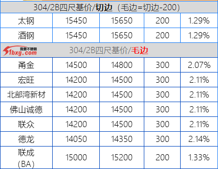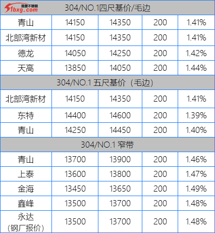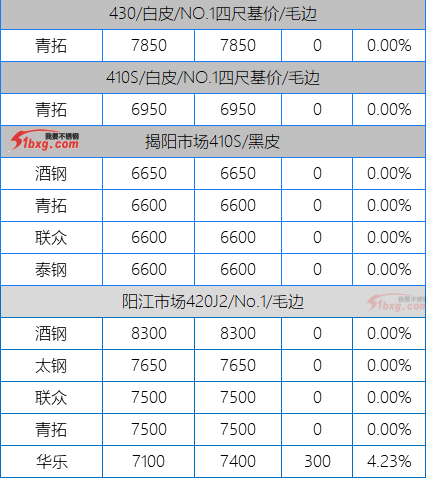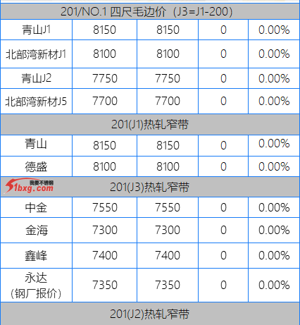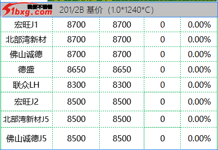 今日,青山代理報(bào),J1-8150元/噸,J3-7950元/噸,J4-8650元/噸,J2-7750元/噸,交貨期仍是3月10日前。市場(chǎng)貿(mào)易商整體報(bào)價(jià)波動(dòng)不大,但價(jià)格依然有高低不一呈現(xiàn)??梢?jiàn)報(bào)價(jià)有,鼎信J2不含稅報(bào)價(jià)7120-7150元/噸;北部灣新材報(bào)J5料7700元/噸,J1四尺8100元/噸,J1五尺8200-8250元/噸(期貨8150);寶鋼BN1TL窄帶7600元/噸,大板7700元/噸;中金J3含稅7530-7550元/噸;中金J5料、金海J3料、鑫峰J3料、永達(dá)J3料7380-7500元/噸。